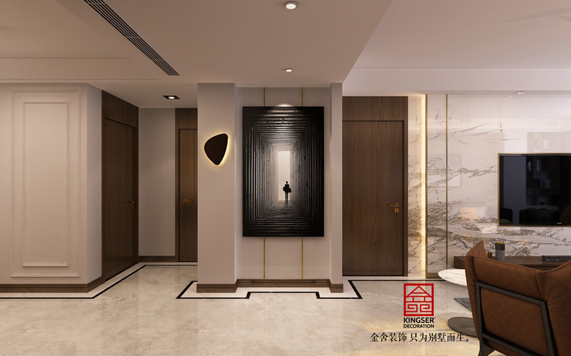 此方案業(yè)主為年輕新婚夫婦,對新家有無限的美好憧憬,所以在出設(shè)計方案的時候更注重顏色以及燈光的舒適度。沒有做太多復(fù)雜的造型,只是用天然石材以及護墻板的木紋紋理來襯托出現(xiàn)在風(fēng)格的時尚氣息。地面瓷磚的鋪貼方式也沒有采用傳統(tǒng)的分空間區(qū)域的方式來做造型拼花,而是采用了對工人師傅施工工藝要求很高的波導(dǎo)線繞墻鋪貼方式,這樣從視覺感上擴大了整個空間的空間感。這樣也不會限制家具擺放的位置,后期家具進場后可以根據(jù)業(yè)主自己的使用喜歡擺放不同的角度。