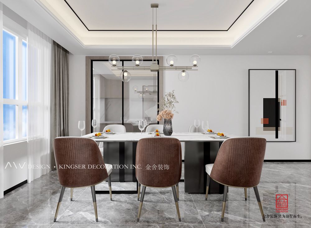 餐廳沿襲客廳原木與純白的色調(diào)搭配,布藝餐椅給空間增添了一抹古樸的自然,原木方桌配置圍合起就餐的溫度與禮序。圓形掛畫點綴其中,為空間注入一股明媚,生氣悠長。
