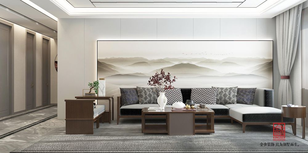 客廳:主要黑白灰配中式原木家具裝飾,吊頂運用簡單的平頂以極窄黑色線條勾勒,時尚的屏風起空間分離作用,并且時尚造型很有裝飾感,沙發(fā)背景是一整幅山水畫的效果起點睛效果.