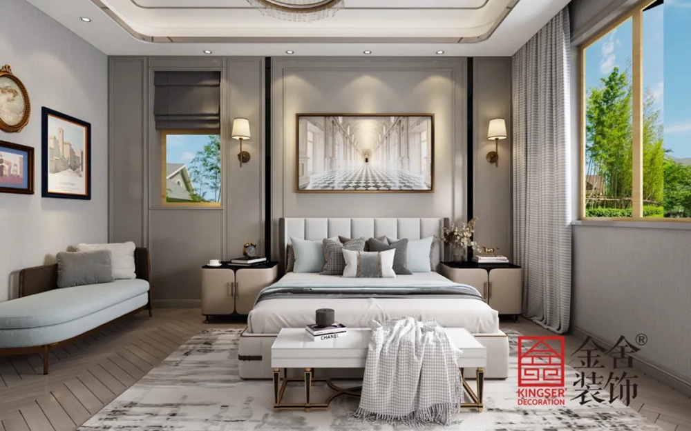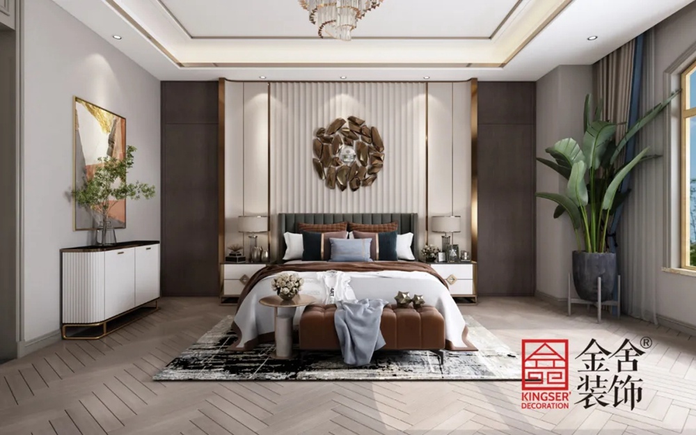 臥室質(zhì)雅溫和,墻面的景致為房間增添了一絲悠遠(yuǎn)之意。白茶色,在印象之中是溫暖而含蓄的,這樣的色彩與金色搭配,于空間中娓娓道來,單單在感官上就能引起所有的注意力。