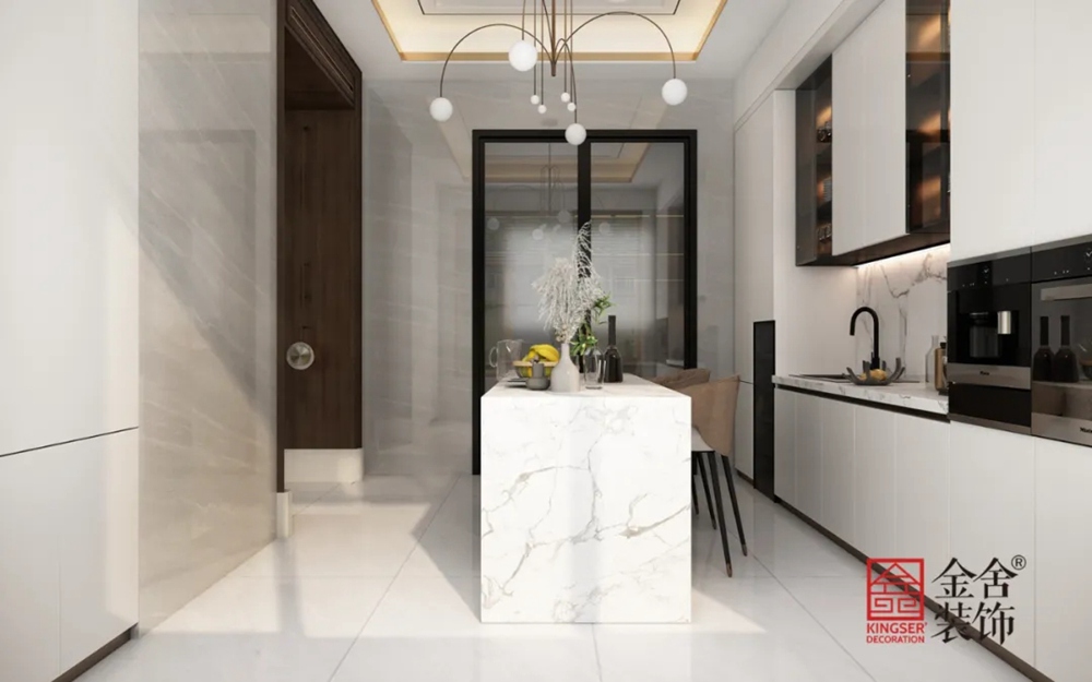 餐廳設(shè)計(jì)現(xiàn)代而不失整體的中式韻味,樣式新穎的餐椅和酒柜在細(xì)節(jié)處糅合了現(xiàn)代家具的設(shè)計(jì)美學(xué)。西式餐具于優(yōu)雅里凸顯莊重自得的心態(tài),清新盆景營造出馨香深遠(yuǎn)沁人心脾的就餐氛圍。