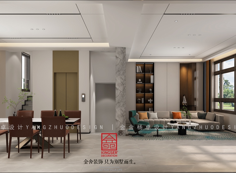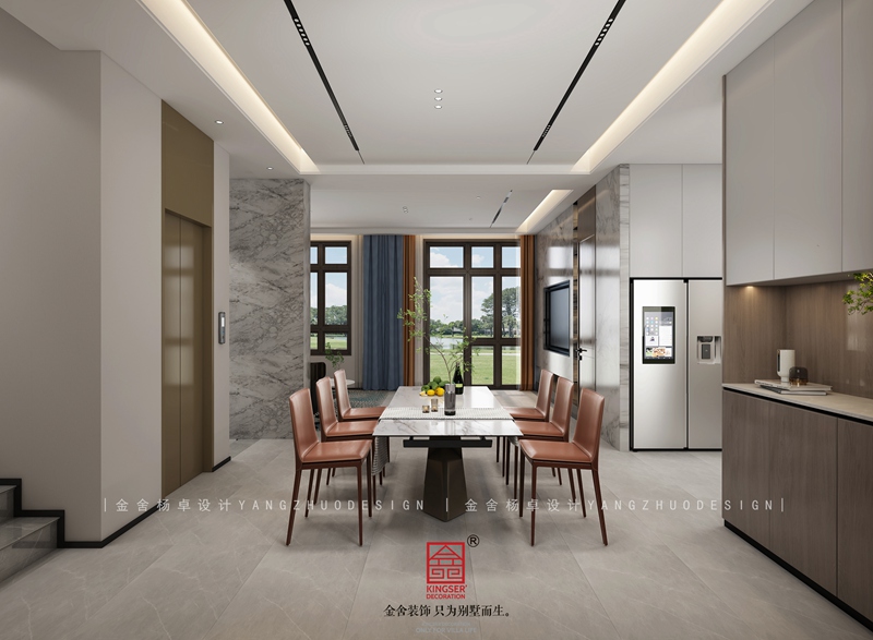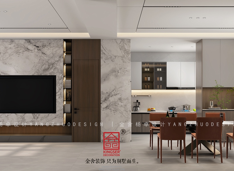 金舍裝飾-西山林語322平米現(xiàn)代簡(jiǎn)約風(fēng)格裝修效果圖。開放式設(shè)計(jì)加強(qiáng)了客廳,餐廳和廚房的互動(dòng)性,將有限空間內(nèi)的空間功能化。餐桌上方的吊燈為用餐帶來了儀式感。內(nèi)飾選用天然的材料,質(zhì)感和色澤大多來源于自然的饋贈(zèng),搭配起來和諧舒適,也自帶一種沉靜溫暖,安定人心的氣質(zhì)。