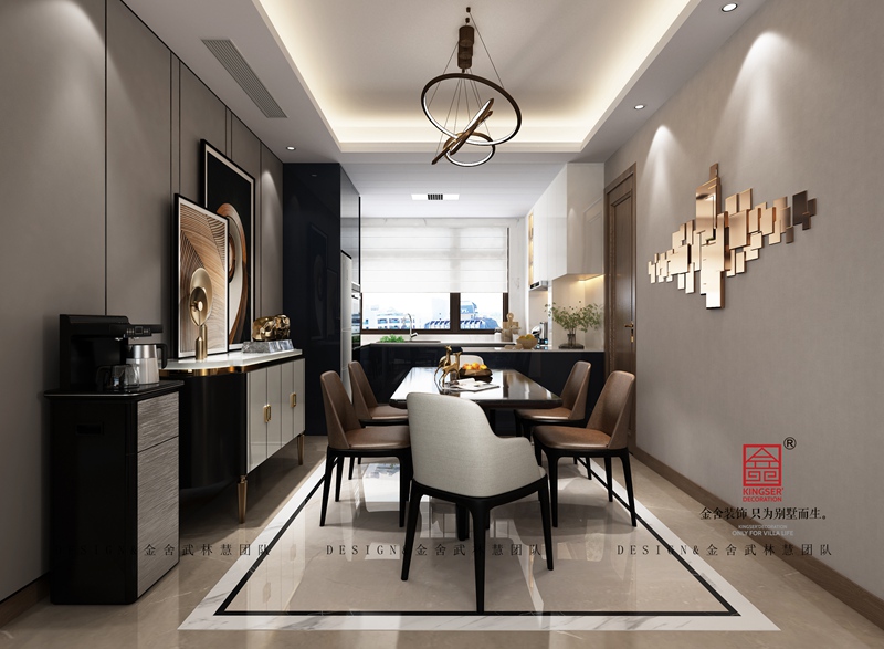 此案例為金舍裝飾-西山林語(yǔ)170平米輕奢風(fēng)格裝修效果圖。夫妻兩人希望新居能夠帶給自己與眾不同的、放松且舒緩的生活氛圍。比如說(shuō),一件家具陳設(shè)不單只是實(shí)用,它也能傳遞出美與裝飾性,讓我們可以在目光所及的環(huán)境中不自覺就被吸引,繼而轉(zhuǎn)化為豐腴的精神意境,最后傳遞出生活中的美好與快樂(lè)。利落干凈的線條設(shè)計(jì)為原始狹窄且幽閉的玄關(guān)空間做出視覺減法,拆除部分廚房墻體改造為敞開式廚房,最大限度將外部的自然光線引入。靈活與實(shí)用兼收并蓄。