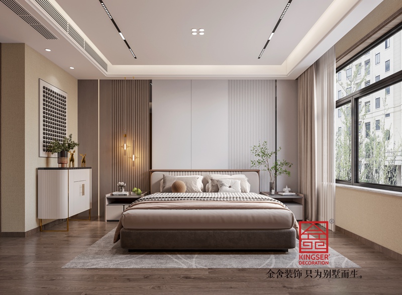 主臥以暖色調(diào)為主,配黑色鏡面金屬條。也是溫馨也有清冷,只有溫和高貴,才與之匹及。
