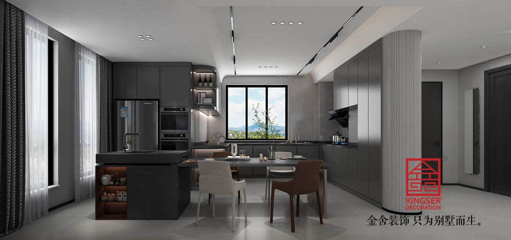 當陽光傾灑坐在沙發(fā)中,放空自己感受時間的游走,肌理、質感,設計中以極簡的黑灰融合為基調,借助材質、燈光、軟裝等,搭配表達一種安靜自然的生活規(guī)律,干凈簡潔的設計與克制的姿態(tài),生活顯得更為純粹歲月安然,不慌不忙、不緊不慢,一切都抒寫在沉默的空間里。