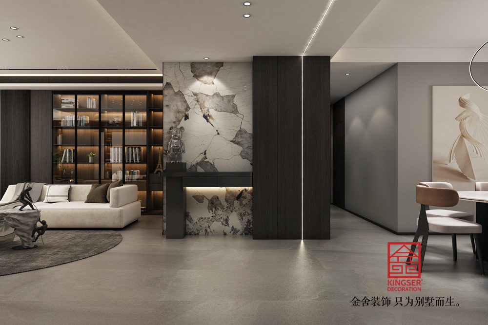 此案例為金舍裝飾-德賢華府190平米現代風格裝修效果圖。現代風格的主要設計理念是簡潔、舒適,沒有多余的裝飾,線條簡單,室內空間大方。簡約風格的設計不是缺乏設計要素,而是一種更高層次的設計境界。在滿足功能需求的前提下,將空間、人及物品進行合理精致的組合,用最洗練的筆畫,描繪出最簡潔素雅的空間效果,這是設計藝術的境界。用的元素,去滿足人們的設計需求,這個需要設計師去思考,實踐?,F代風格外形簡潔、功能強,強調室內空間形態(tài)和物件的單一性、抽象性。