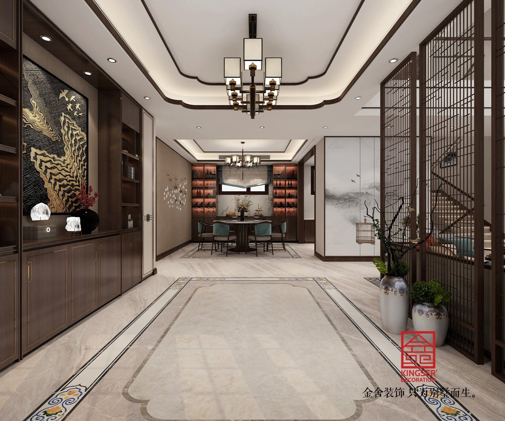 設(shè)計(jì)說明:此案例為金舍裝飾-藁城自建別墅226平米新中式風(fēng)格裝修效果圖。新中式風(fēng)格的家居環(huán)境設(shè)計(jì)應(yīng)該是中國(guó)傳統(tǒng)文化與現(xiàn)代生活需求相結(jié)合的表達(dá)。雖然現(xiàn)代許多人都追求西方的新型的設(shè)計(jì)理念,但是還是有許多人傳統(tǒng)的中國(guó)元素的喜愛,但是照搬傳統(tǒng)的中式設(shè)計(jì),會(huì)讓整體的設(shè)計(jì)略顯古板、沉悶,所以為了迎合現(xiàn)代人對(duì)于現(xiàn)代化的設(shè)計(jì),同時(shí)加上對(duì)于古典文化的喜愛,就創(chuàng)新的設(shè)計(jì)出了現(xiàn)代化的設(shè)計(jì)理念與傳統(tǒng)的中國(guó)元素相結(jié)合的新中式裝修。每個(gè)家庭的裝修中都需要擁有功能性的設(shè)計(jì),這也是一個(gè)家居裝修中最主要的目的。新中式風(fēng)格的設(shè)計(jì)理念也體現(xiàn)出了功能性的設(shè)計(jì)新中式風(fēng)格的家具大多數(shù)采用實(shí)木型對(duì)材料,能夠滿足整體實(shí)用的功能性。比如鏤空的屏風(fēng)設(shè)計(jì),既體現(xiàn)其視覺上的美感,又具有實(shí)用性。
