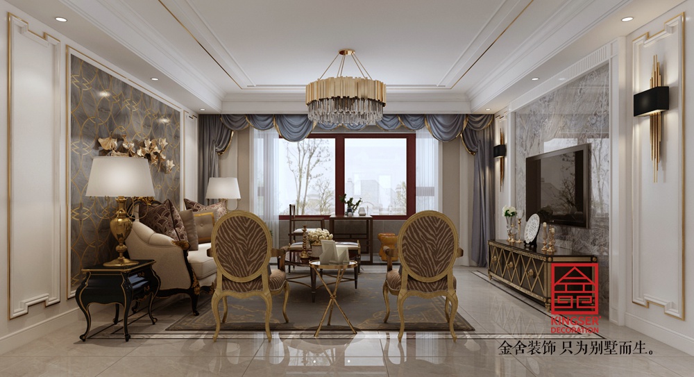 設(shè)計理念: 步入寬敞明亮的客廳,以白色作為基調(diào),金色作為點綴與其他色彩共同營造出華麗的氣質(zhì)。精致的金屬水晶吊燈、經(jīng)典的歐式石膏線、精美的歐式壁燈,用金色的線條勾勒空間,展現(xiàn)令人驚嘆的奢華空間氛圍。